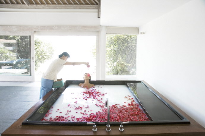 A renowned skin brightener, green tea is rich in beautifying antioxidants. After a good knot-releasing massage using one of our selection of essential oils, gently exfoliate using our green tea and rice powder scrub – perfect for sensitive, fragile skin. Soothe further with our seaweed wrap, blended with ginger and lemongrass to help penetrate the sea-derived nourishments deep into the skin. Finally, close your eyes and relax as the Chamomile Ginger Bath quiets your mind, warms your spirit, and lull you to blissful oblivion. Let us know if you need a wake up call.